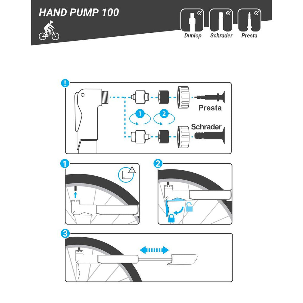 1) Select the correct connector for your inner tube's valve (by inverting part of the head. See diagram in the product photos). 2) Push the pump onto the valve. 3) Use the grey lever to clip the pump into place. 4) Inflate to the desired pressure.