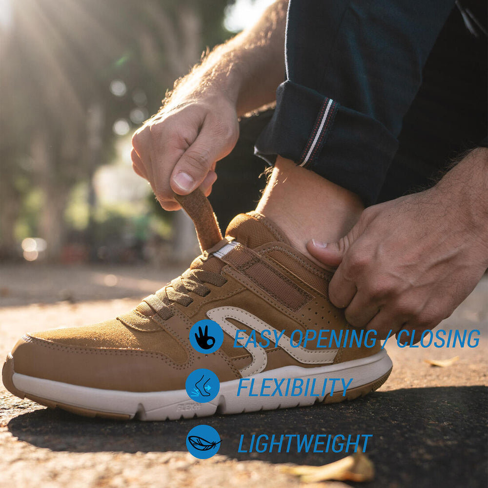It is easy to put on thanks to its elastic laces and rip-tab, and easy to match with your outfit.Its comfort, leather and urban look mean you can walk all day long.