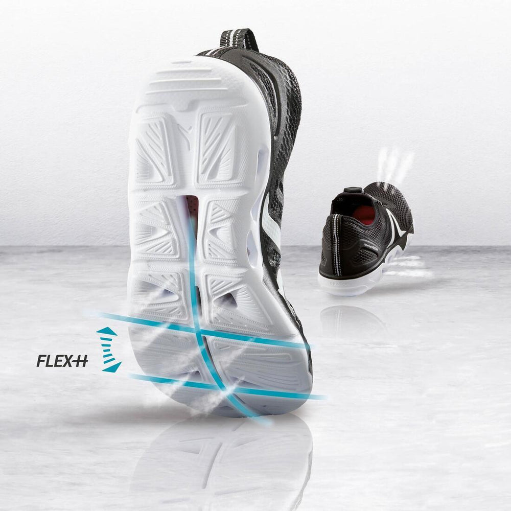 The Flex-H technology has three flex grooves in an H-pattern located at the forefoot. This gives the foot the flexibility it needs for the propulsion phase.