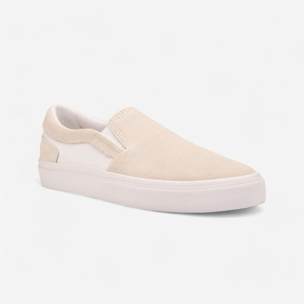 New vulcanised skate shoes are generally fairly narrow during the first few uses, especially the Slip-On models.They adjust after being worn for a few hours (the vulcanised band deforms to fit the foot). The best thing is to get skate shoes that are fitted.For narrow feet, we recommend choosing your usual size.For wide feet, do not hesitate to choose one size above, especially when wearing them on a daily basis.