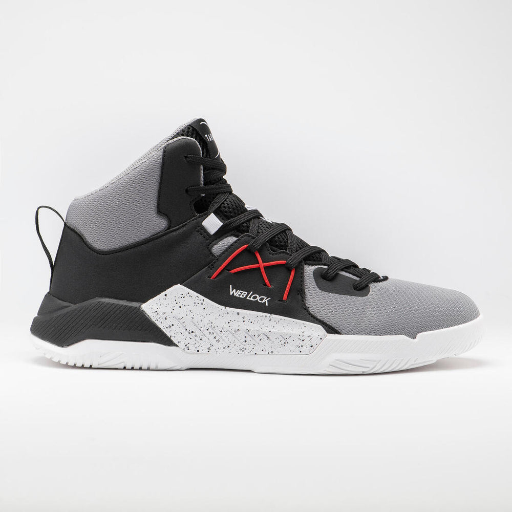 This basketball shoe from Tarmak comes with an injection-moulded foam (EVA) cushioned sole, extra cushioning at the heel, and a high-rise upper with ventilation zones.