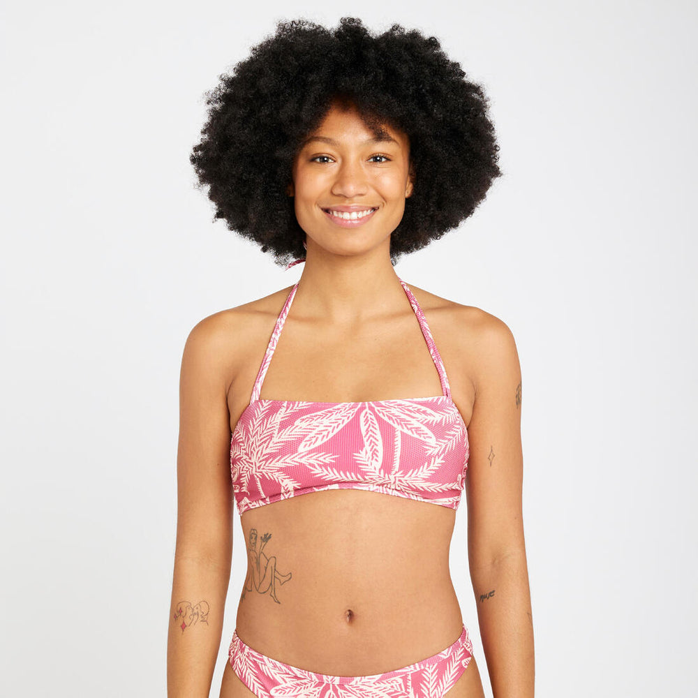 Bandeau swimsuit top with a minimalist design for female surfers looking for style and convenience in calm conditions.