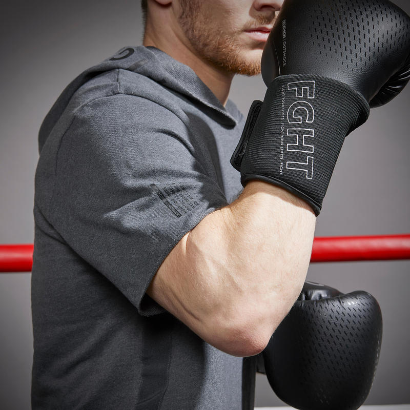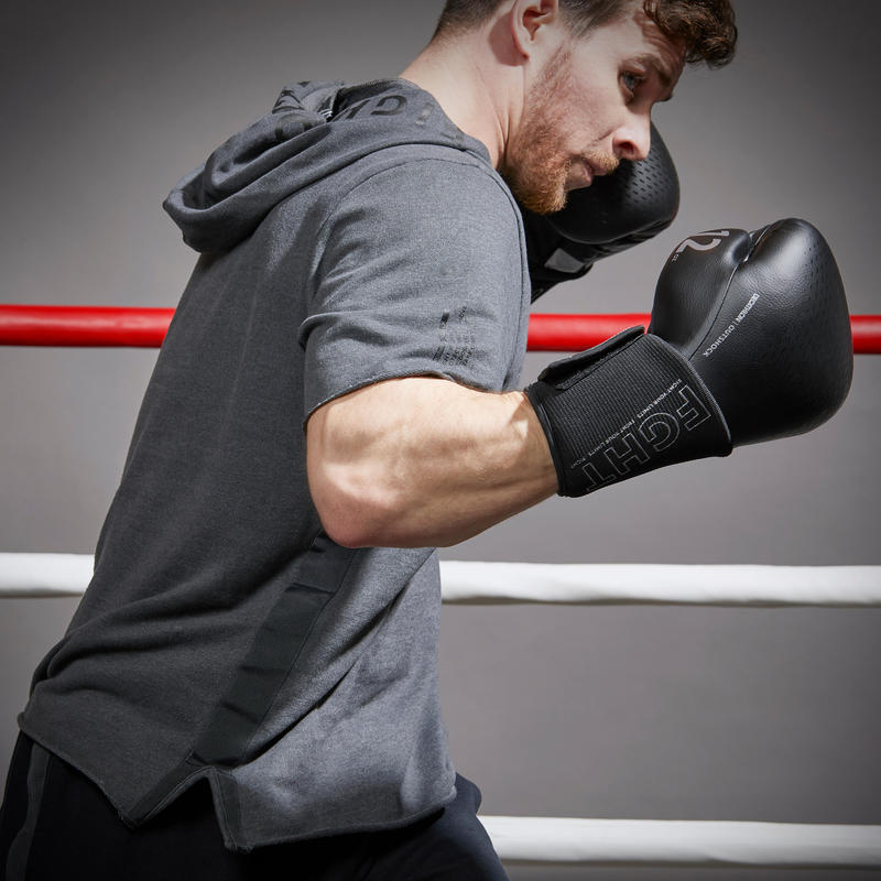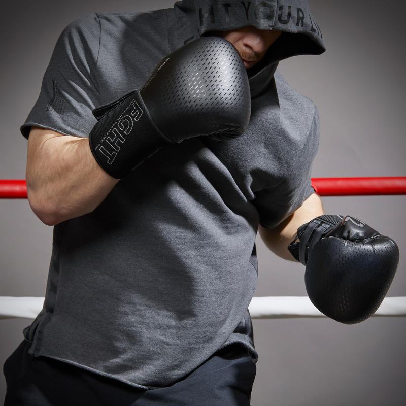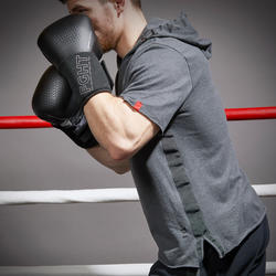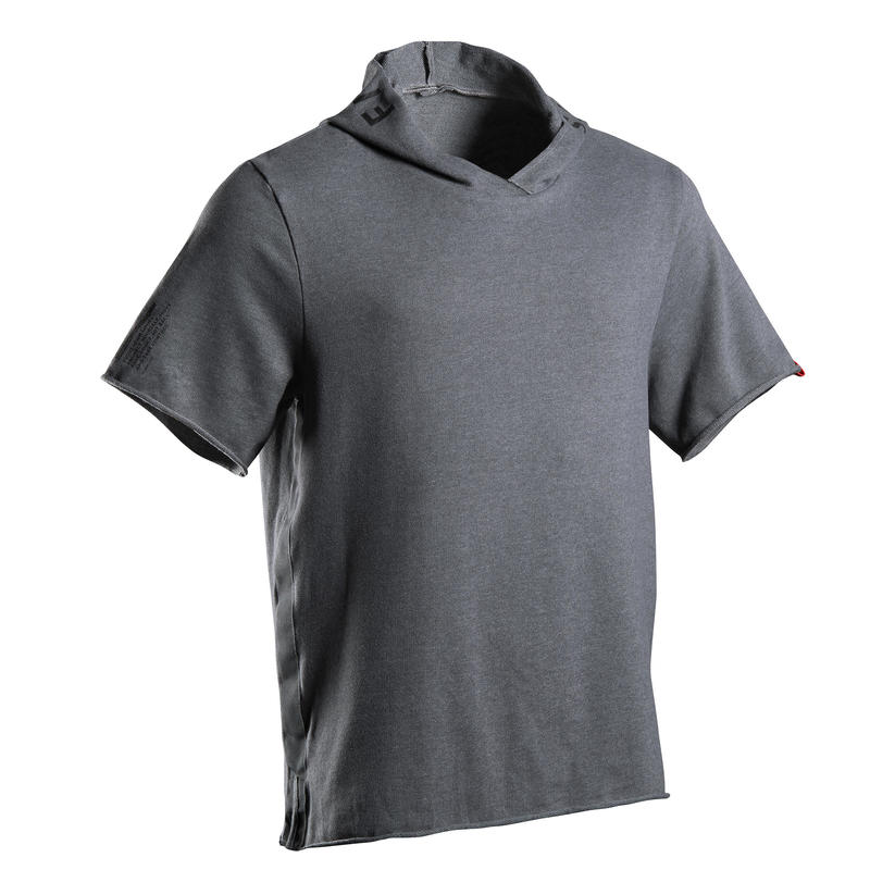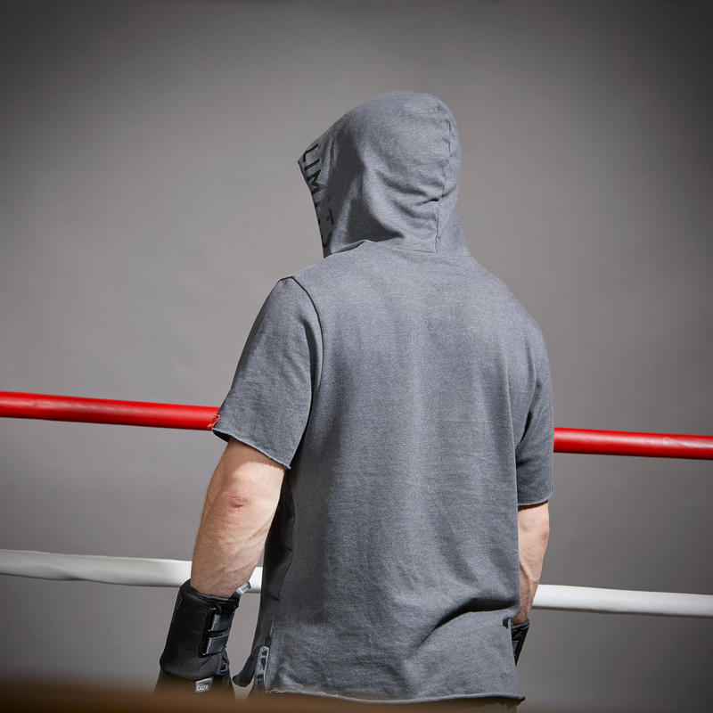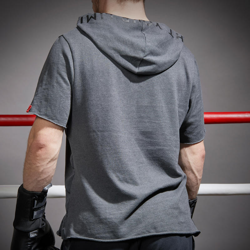 The hooded T-shirt designed for boxing warm-ups. Wide cut at the shoulders provides ample freedom of movement. Includes a hood to keep you warm when not moving.